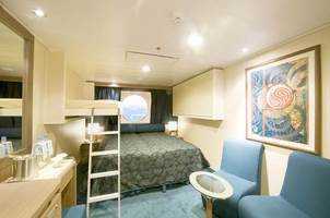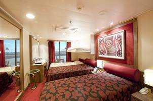 Janela com vista mar - 2 camas de solteiros ou uma cama de casal (exceto nas cabines destinadas aos portadores de deficiencia fisica) - armario espacoso - banheiro - TV interativa - Telefone - frigobar - Cofre - Ar condicionado - Area de 13 a 29 m2 (disponivel apenas Bella e Fantastica).